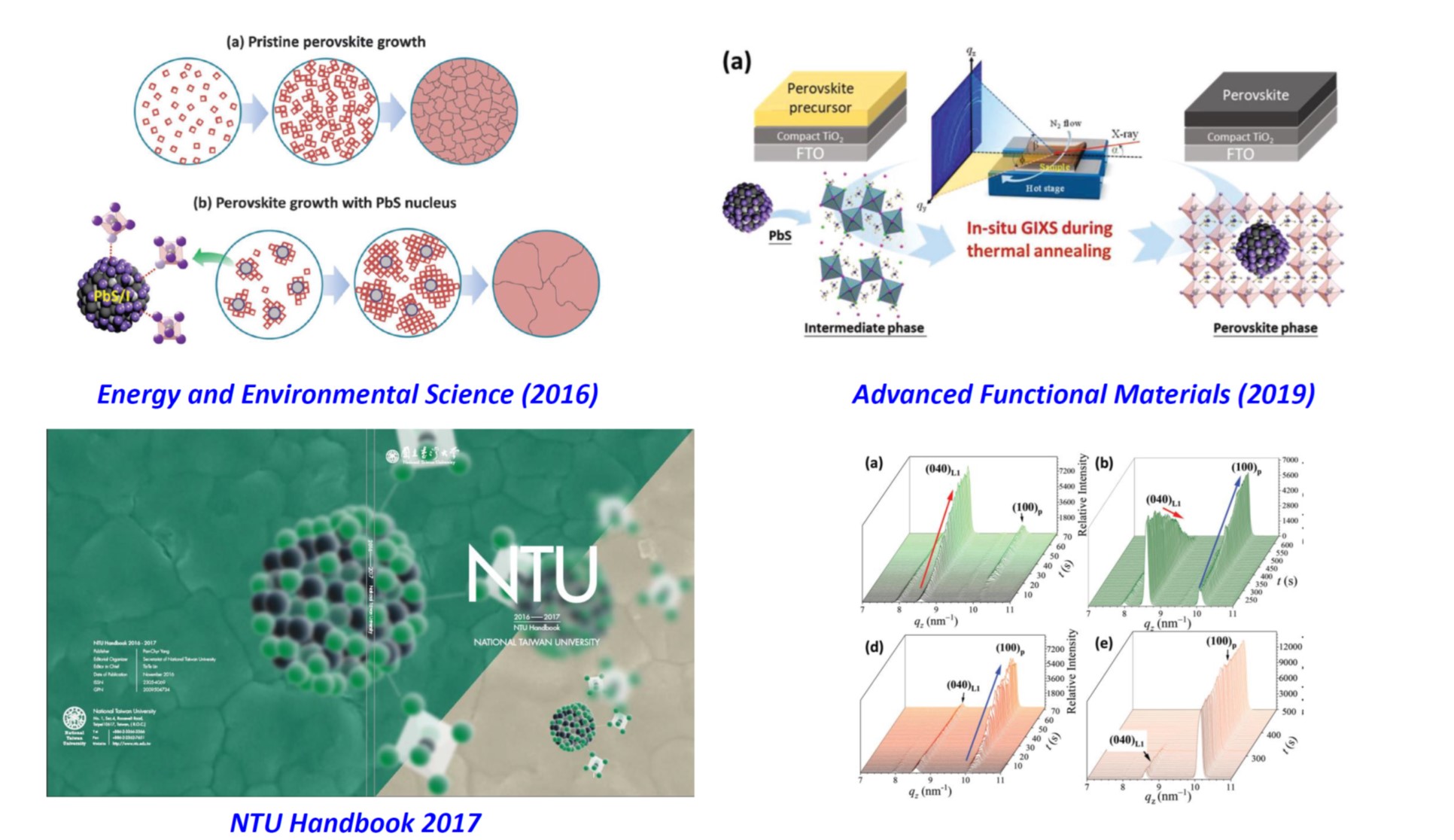 This work proposes a novel approach to modulate the nucleation and growth of perovskite crystals in planar perovskite (CH3NH3PbI3xClx) solar cells by intermixing precursor-capped inorganic nanoparticles of PbS. Through this intermixing-seeded growth technique, substantial morphological improvements, such as increased crystal domains, enhanced coverage, and uniformity, were realized in the perovskite thin films, and the corresponding solar cell devices exhibited a promising power conversion efficiency. (Energy and Environmental Science, 9, 1282, (2016)) The corresponding growth mechanism was further unveiled by time-resolved grazing-incidence X-ray scattering. The intermediate structures and the corresponding growth kinetics during conversion to perovskite crystal thin films assisted by seeding PbS nanocrystals (NCs), using time-resolved grazing-incidence X-ray scattering. Through analyses of time-resolved crystal formation kinetics obtained from synchrotron X-rays with a fast subsecond probing time resolution, an important “catalytic” role of the seed-like PbS NCs is clearly elucidated. (Advanced Functional Materials, 1902582, (2019)). Our research result was used as the cover of the NTU handbook on 2017.