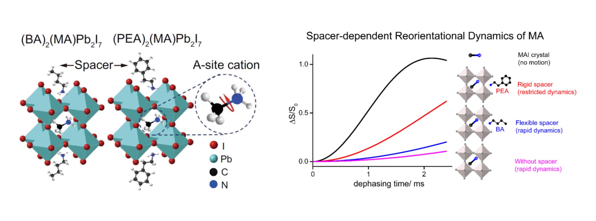 Limited methods are available for investigating the reorientational dynamics of A-site cations in two-dimensional organic–inorganic hybrid perovskites (2D OIHPs), which play a pivotal role in determining their physical properties. Here, we describe an approach to study the dynamics of A-site cations using solid-state NMR and stable isotope labelling. 2H NMR of 2D OIHPs incorporating methyl-d3-ammonium cations (d3-MA) reveals the existence of multiple modes of reorientational motions of MA.(Nature Communications, 13, 1513, (2022)) (Collaboration with Dr. Tsyr-Yan Yu, Academia Sinica)