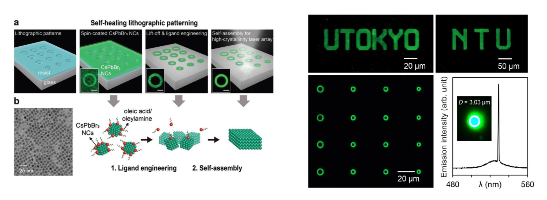 The chief bottleneck to achieving lithography of perovskites lies in their reactivity to chemicals used for lithography as illustrated by issues of instability, surface roughness, and internal defects with the fabricated structures. The realization of lithographic perovskite single-mode lasers in large areas remains a challenge. In this work, a self-healing lithographic patterning technique using perovskite CsPbBr3 nanocrystals is demonstrated to realize high-quality and high-crystallinity single-mode laser arrays. The self-healing process is compatible with the standard lithography process and greatly improves the quality of lithographic laser cavities. A single-mode microdisk laser array is demonstrated with a low threshold of 3.8 μJ cm-2. (Advanced Functional Materials, 2006283, 2021) (International Collaboration with University of Tokyo)